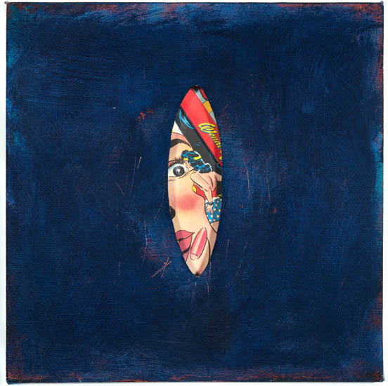 acrylic, found paper, cut canvas, 12" x 12" x 1.5"