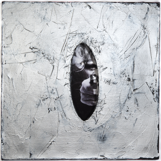 acrylic, found paper, cut canvas, 12" x 12" x 1.5"