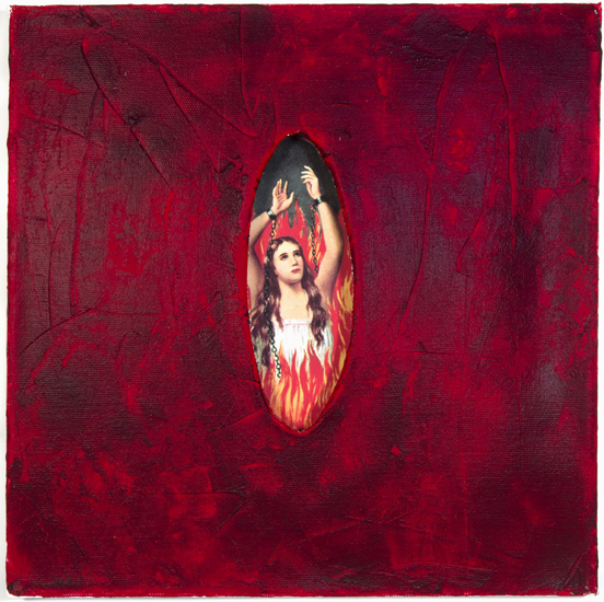 acrylic, found paper, cut canvas, 12" x 12" x 1.5"